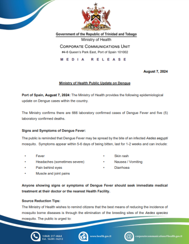 Port of Spain, August 7, 2024The Ministry of Health provides the following epidemiological update on Dengue cases within the country.