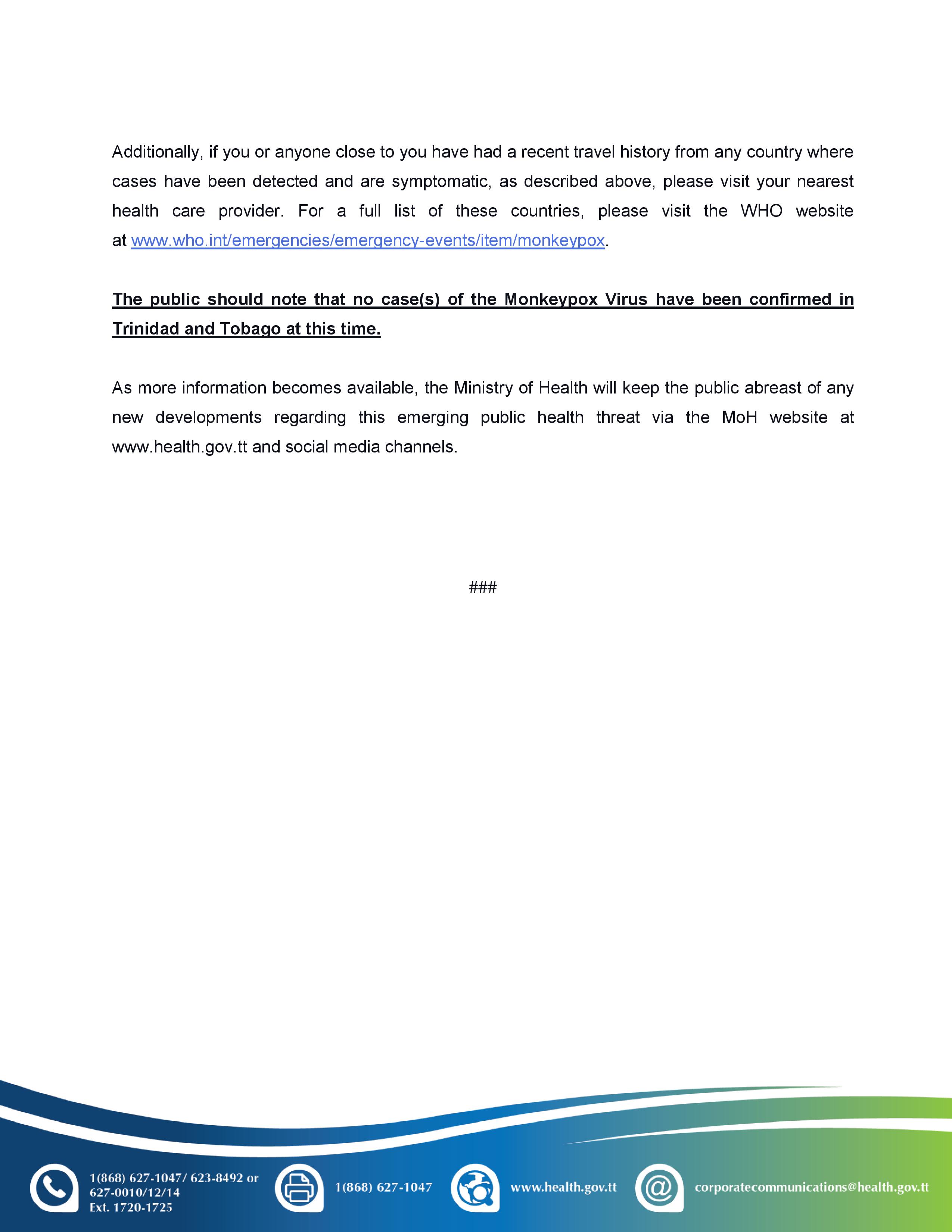 MoH Media Release: Cabinet Approves the Addition of the Monkeypox Virus to the list of Dangerous Infectious Disease in Trinidad and Tobago