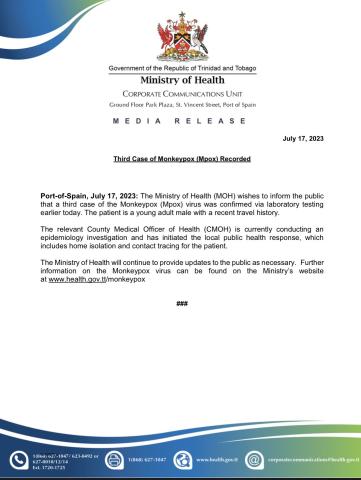 Media Release - Ministry of Health Assures the Public, Systems Implemented to Manage Mpox Trinidad and Tobago Records a Third Case of Monkeypox (Mpox) Trinidad and Tobago Records a Second Case of Monkeypox (Mpox) Trinidad and Tobago Records its First Case of Monkeypox (Mpox) Ministry of Health Monitors Monkeypox Outbreak Cabinet Approves the Addition of the Monkeypox Virus to the list of Dangerous Infectious Disease in Trinidad and Tobago Ministry of Health Monitors Monkeypox Outbreaks - 20th May, 2022