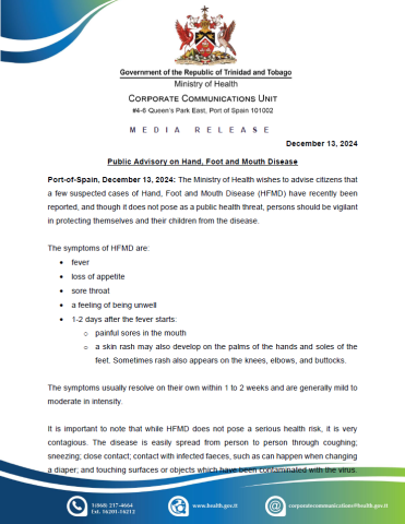 Port-of-Spain, December 13, 2024: The Ministry of Health wishes to advise citizens that a few suspected cases of Hand, Foot and Mouth Disease (HFMD) have recently been reported, and though it does not pose as a public health threat, persons should be vigilant in protecting themselves and their children from the disease.